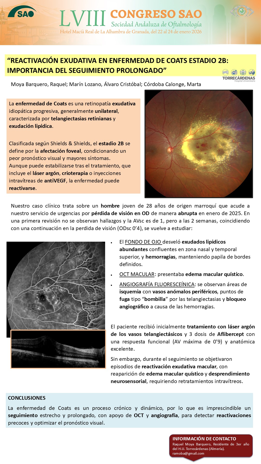 Usted va a votar como Mejor póster informativo: "“REACTIVACIÓN EXUDATIVA EN ENFERMEDAD DE COATS ESTADIO 2B: IMPORTANCIA DEL SEGUIMIENTO PROLONGADO”".