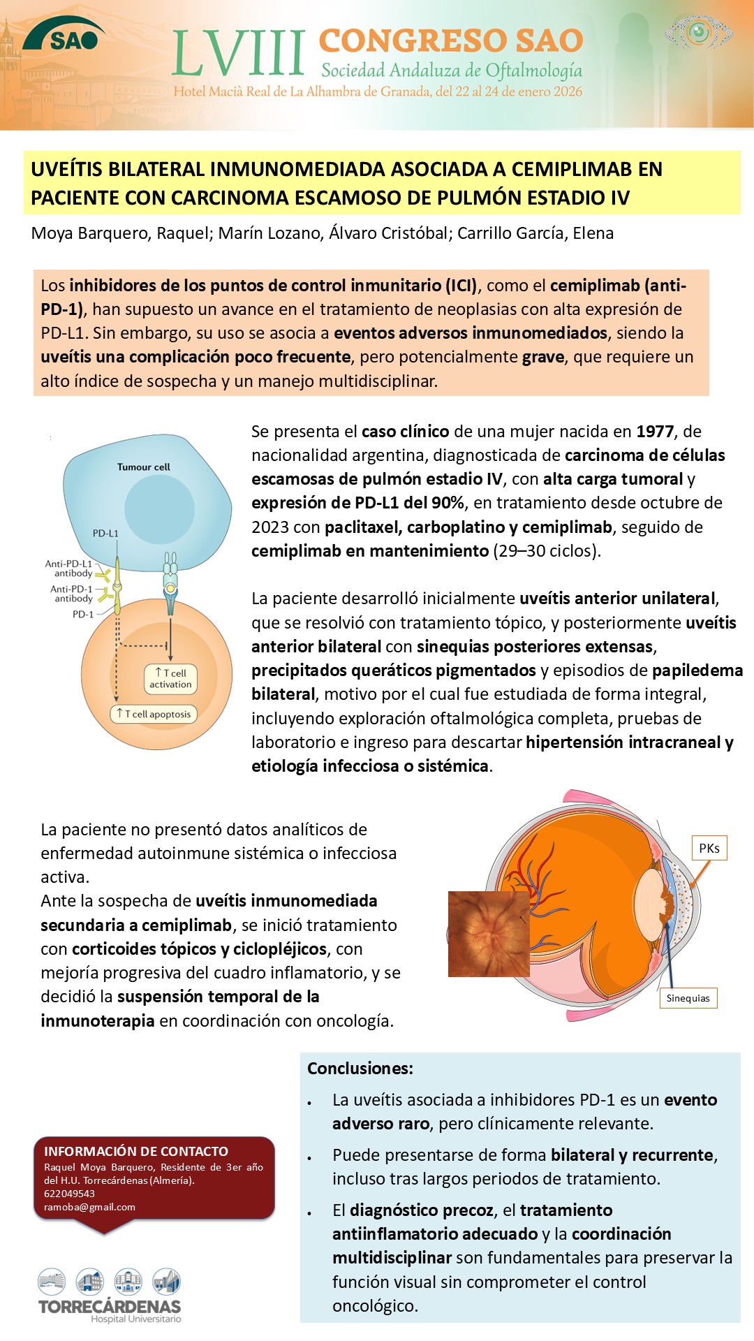 Usted va a votar como Mejor póster informativo: "UVEÍTIS BILATERAL INMUNOMEDIADA ASOCIADA A CEMIPLIMAB EN PACIENTE CON CARCINOMA ESCAMOSO DE PULMÓN ESTADIO IV".