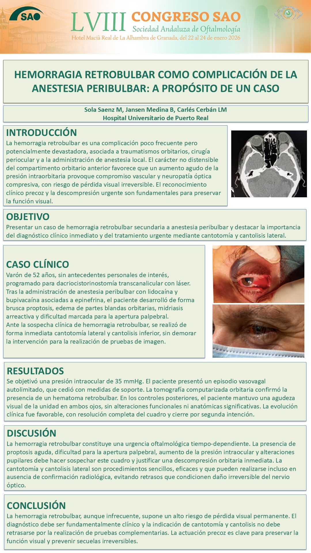 Usted va a votar como Mejor póster informativo: "HEMORRAGIA RETROBULBAR COMO COMPLICACIÓN DE LA ANESTESIA PERIBULBAR: A PROPÓSITO DE UN CASO".